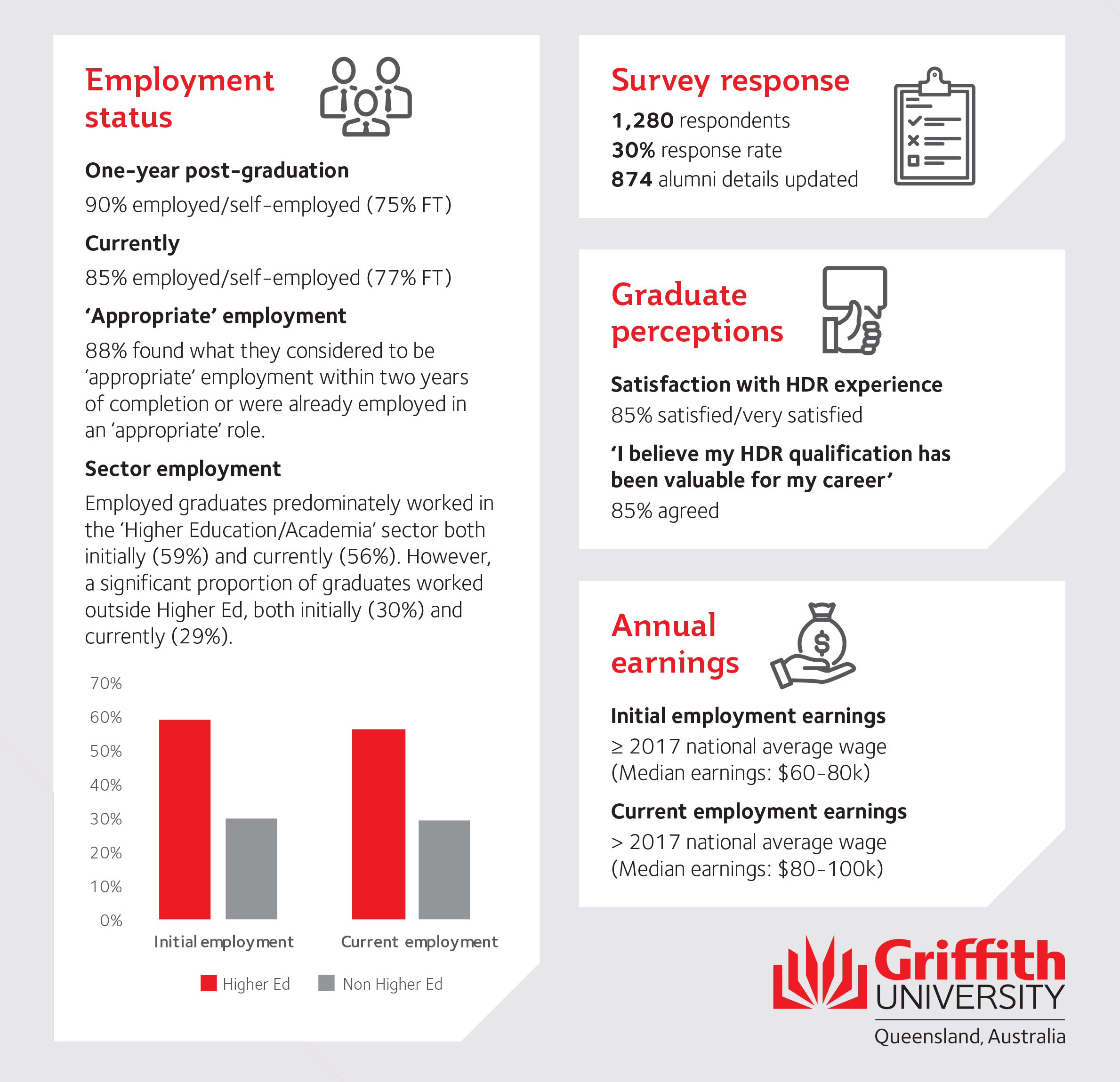 “Undertaking a PhD does not just provide a deep understanding of a particular discipline; it instils the ability to critically analyse complex issues and find new ways of looking at a problem and then to devise and implement solutions. These are essential skills in any workforce. Typically, our graduates reported that the experience of undertaking an HDR was important and professionally useful to them, irrespective of whether they subsequently worked within the field of their PhD discipline.”