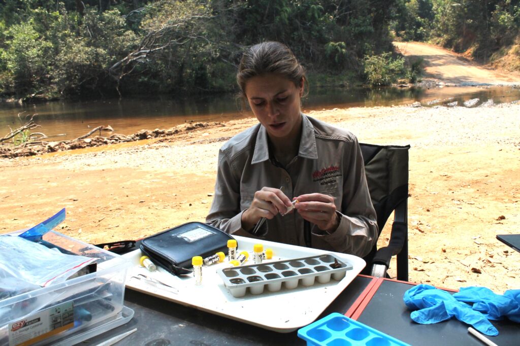 Dr Kaitlyn O’Mara processes invertebrate samples, which will could determine the Bloomfield River cod’s diet.